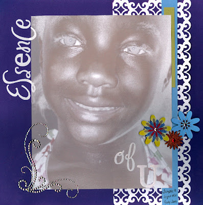 I was playing around with my PSE7 program the other day and did this to one of Temple's pictures. What is "did this?" you ask, well I'm not quite sure. The next time I'm fiddling with PSE7 I'll pay more attention. But I found this so striking that I printed it out and then tried to figure out what I'd do with it. Well, I decided that I could do a layout with it just like I would do a LO with a regular photo. This is my result. As you can see, it's a very simple LO (done in about 20 minutes), but with this pic, I really needed it to be the focus, so elaborate embellies were not required.