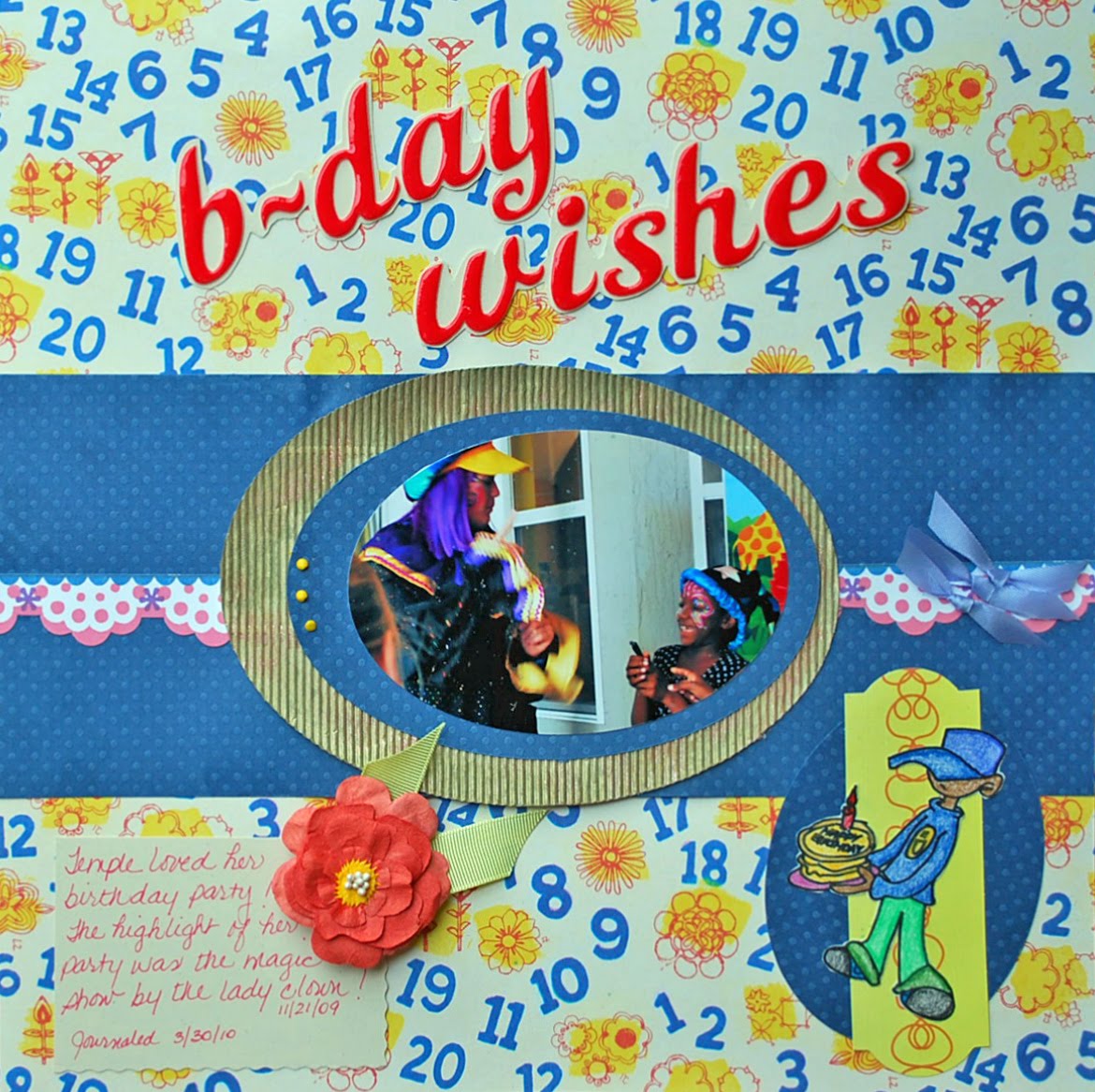 Temple had such a super, duper birthday party on 11/21/09 (which is her actual birthday) and I haven't done much in regards to scrapbooking her day. I bought a mini album last November to do just that and I still haven't gotten around to it. I'm glad that I got to do at least this page. Also you will notice that Birthday Edward arrived with a yummy birthday cake!!!