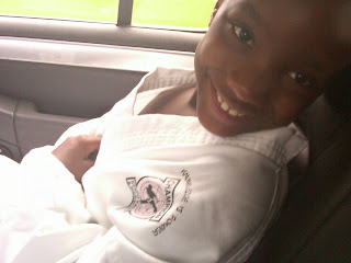 Temple on her way to the Dojo to test for her yellow belt--wish her luck!