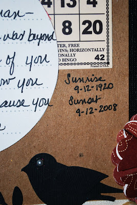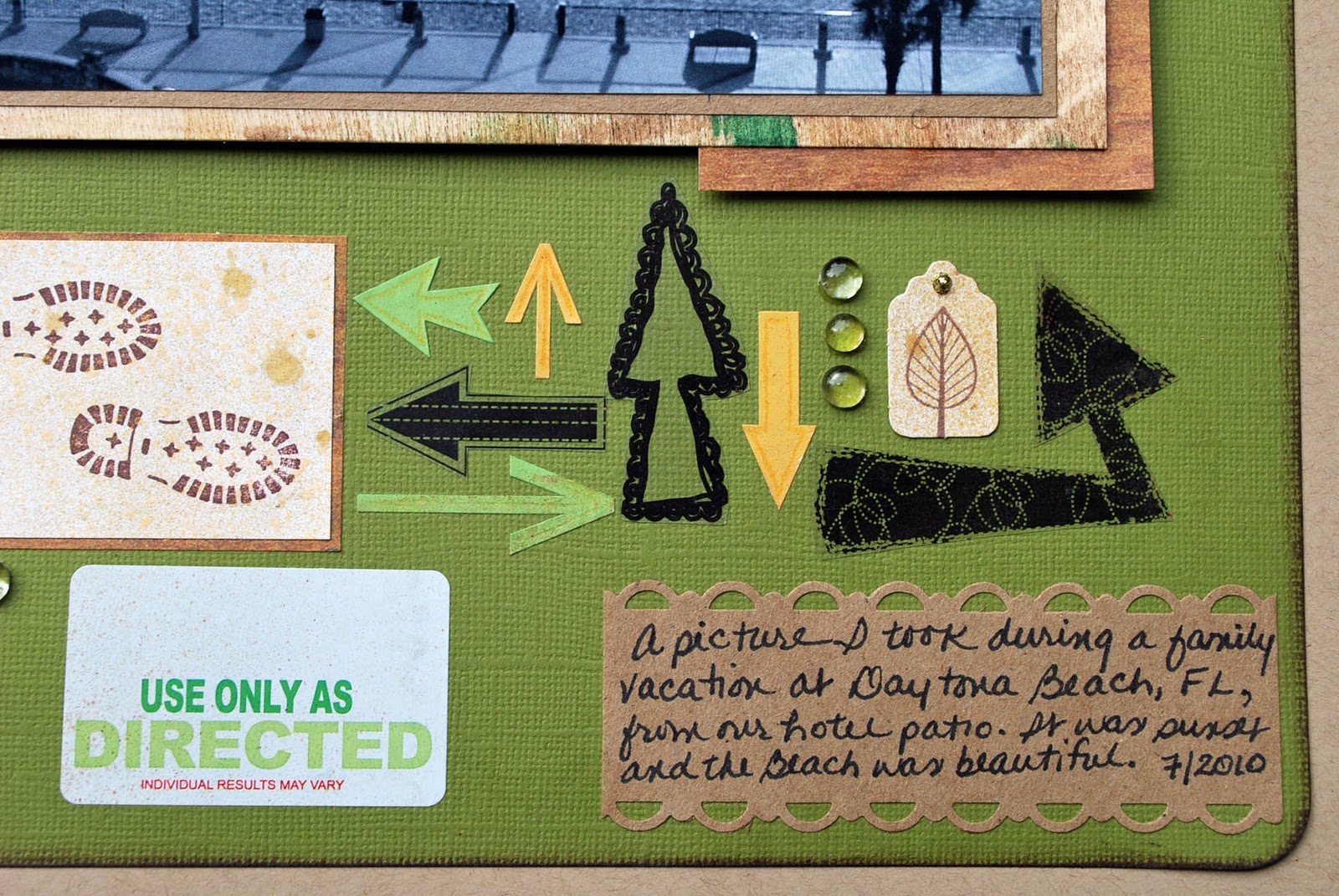 I managed to use all of the embellies in this LO. Of course I didn't take a pic of the goodies before I used them, but a few of them were the arrows, the stamped boots, the word stickers, acrylic beads, brads, and that little tag that I stamped the leaf on. I took that photo from our hotel balcony when we were down in Daytona Beach this summer, and I thought it would work well with this LO's theme. The little flowers that started out yellow and then were shimmerzed and misted by me, came in the goodie package and so did the yellow and brown ribbon.