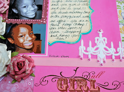 I'd photoshopped the picture of Temple about a year ago, but had never gotten around to using it until this challenge. As you can see, I also pulled out my Cricut to cut out the birds and the chandelier. Here are some close-ups: