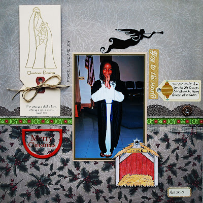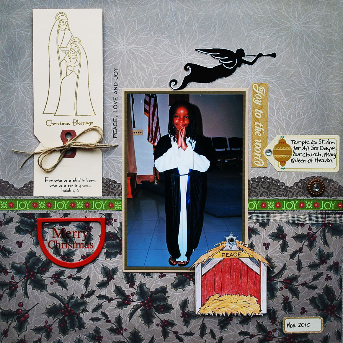 This is a picture of Temple dressed up as Saint Ann (The Virgin Mary's mother) at Church for All Saints Day at the beginning of November. I used gold heat embossing in the tag of the Nativity. My stable is in the lower right and my angel heralding the arrival of Jesus is at the top of the LO.